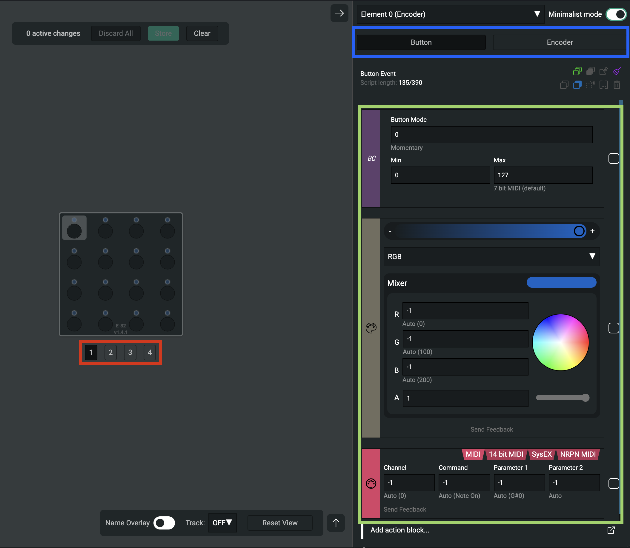 - Event mode will follow how you interact with the hardware, so a button press will show the button event, an encoder turn will show the encoder event.