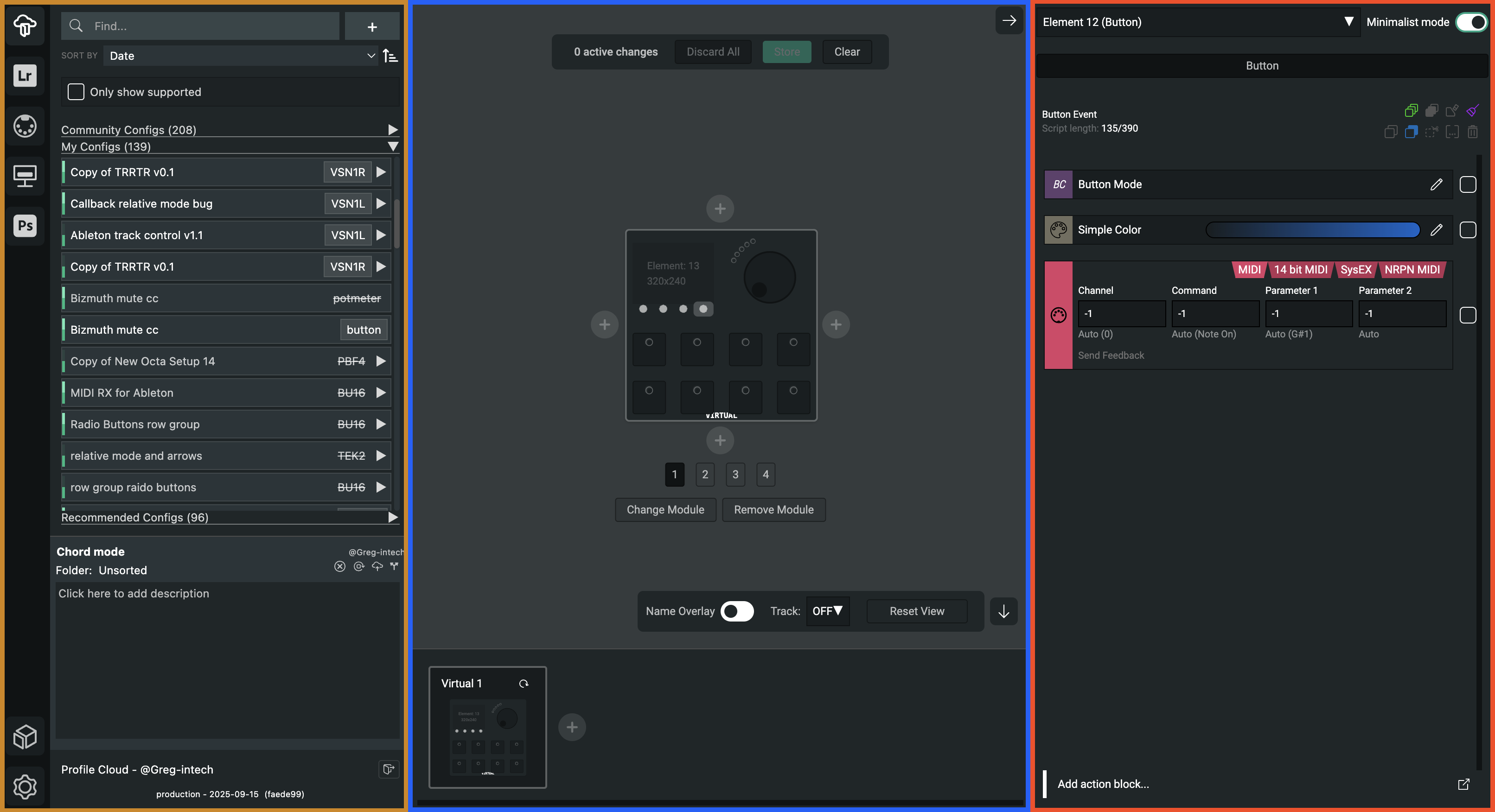 - Center panel: Displays your connected or virtual modules. Always highlights the selected Element with a grey overlay. Here you can also access Pages, fiddle with interaction tracking and primary module operations.
