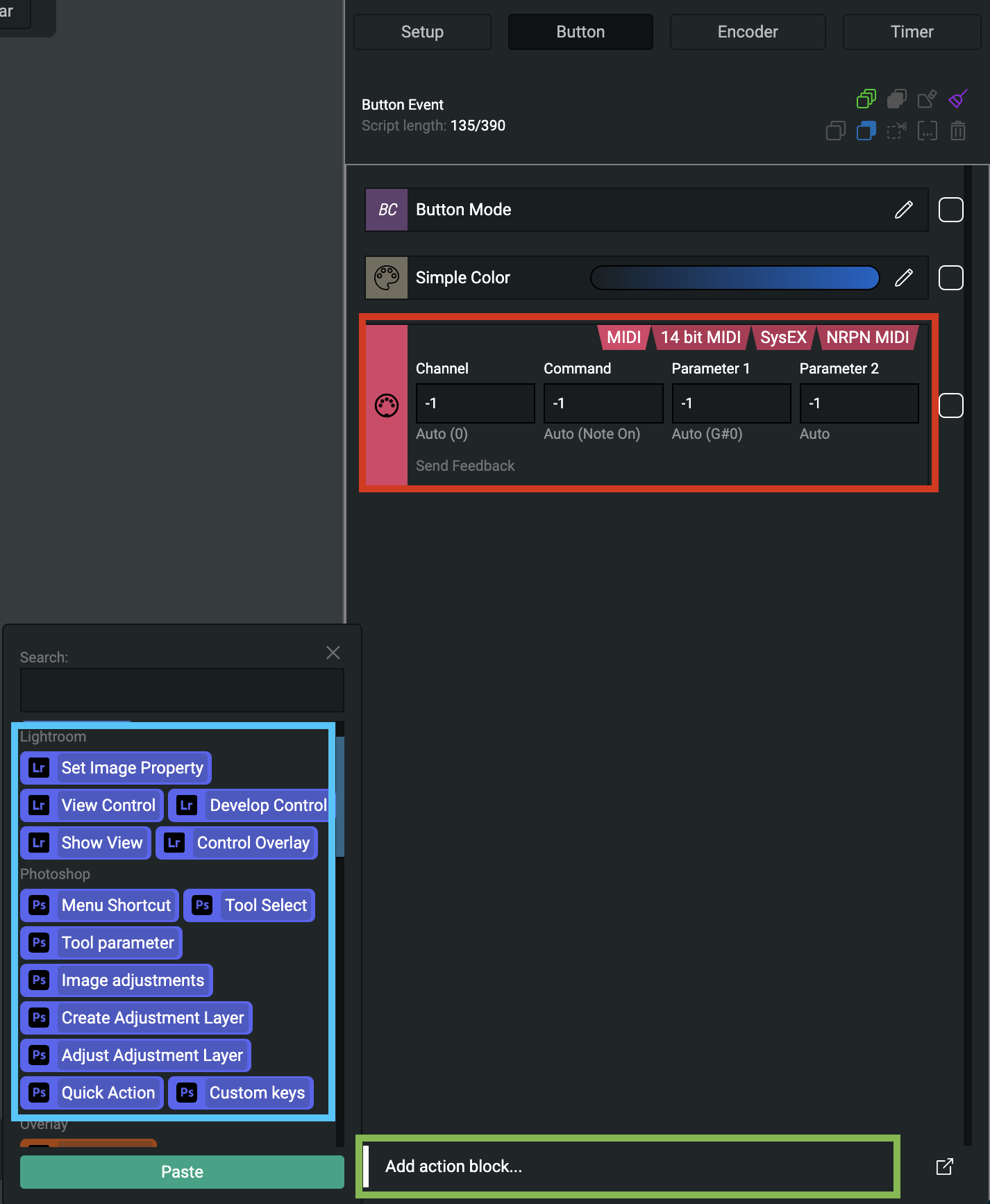 If you want to send messages to software that doesn’t have MIDI support, such as Lightroom, you can add the Lightroom Action Block after activating the Lightroom Package in the Package Manager.